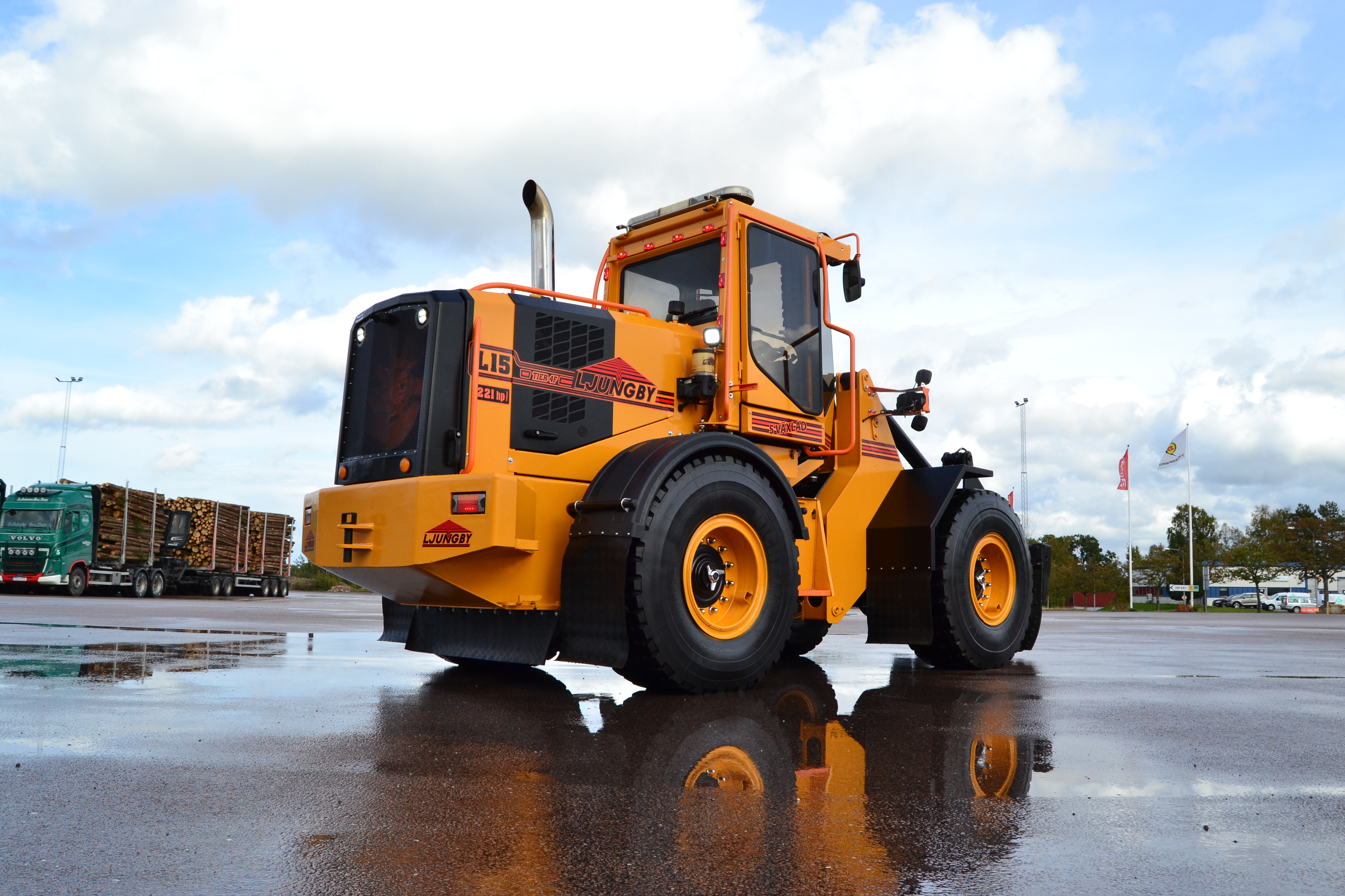 45-graders styrvinkel åt båda håll, vändradie som Volvo L60