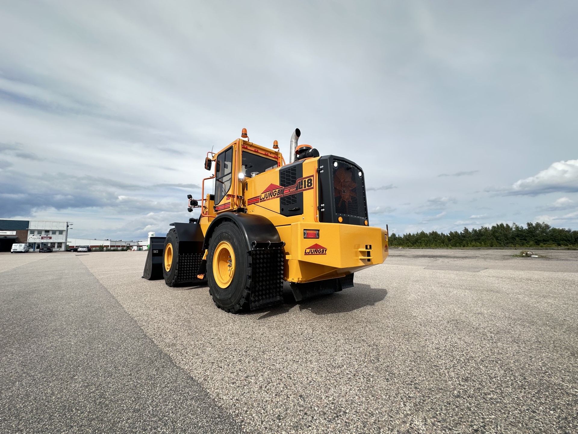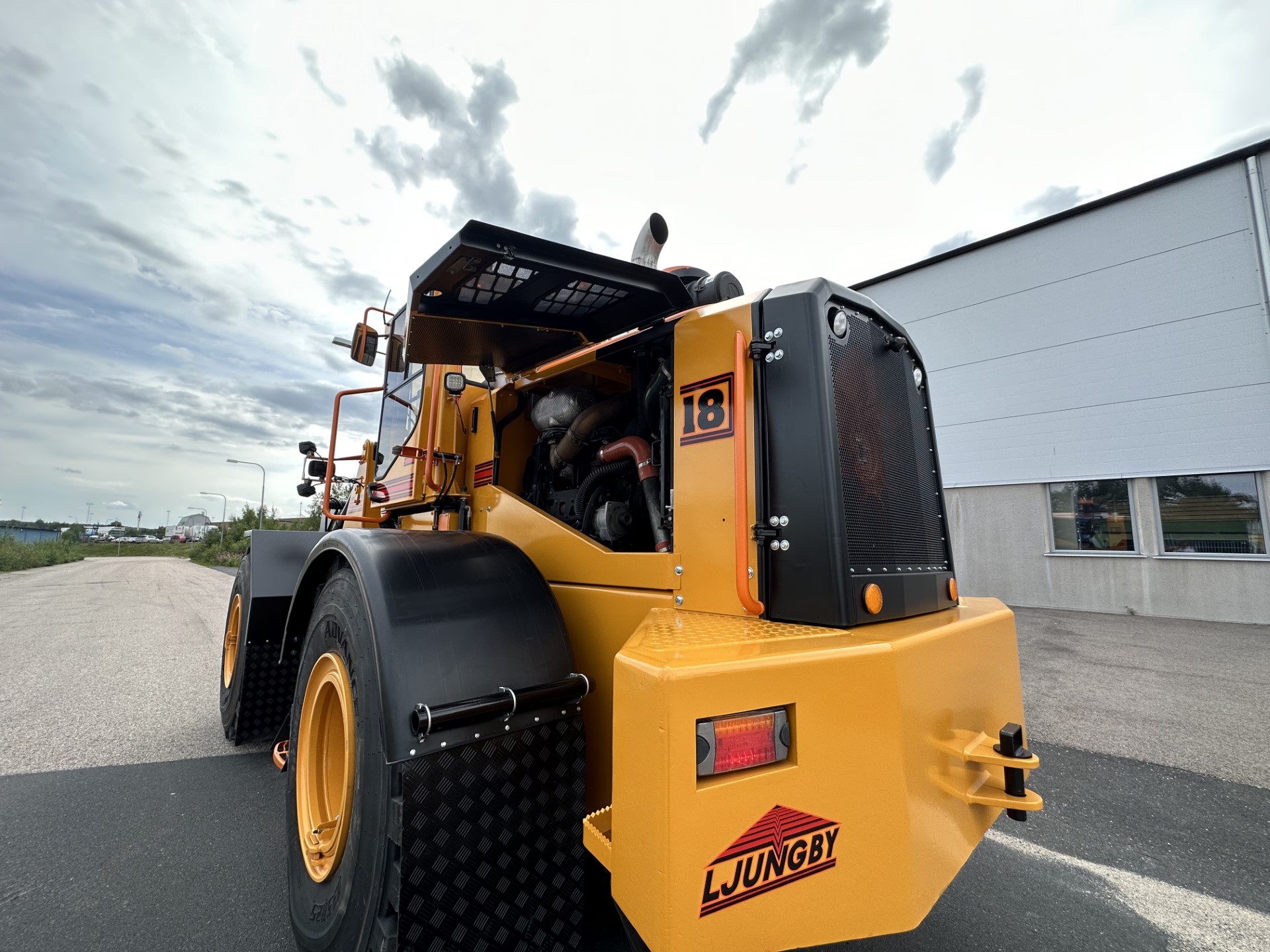 45-graders styrvinkel åt båda håll, vändradie som Volvo L90