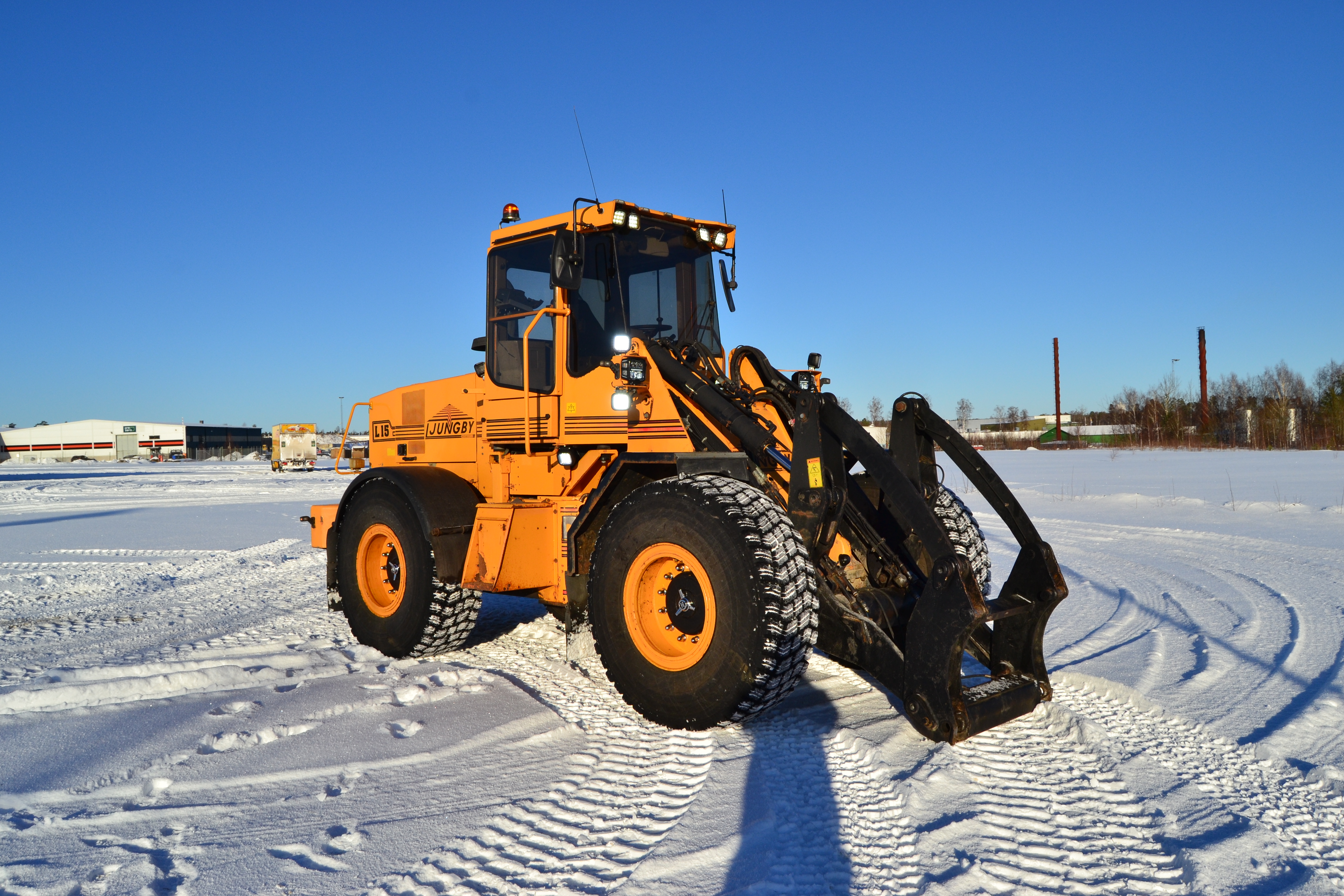 45-graders styrvinkel åt båda håll, vändradie som Volvo L70