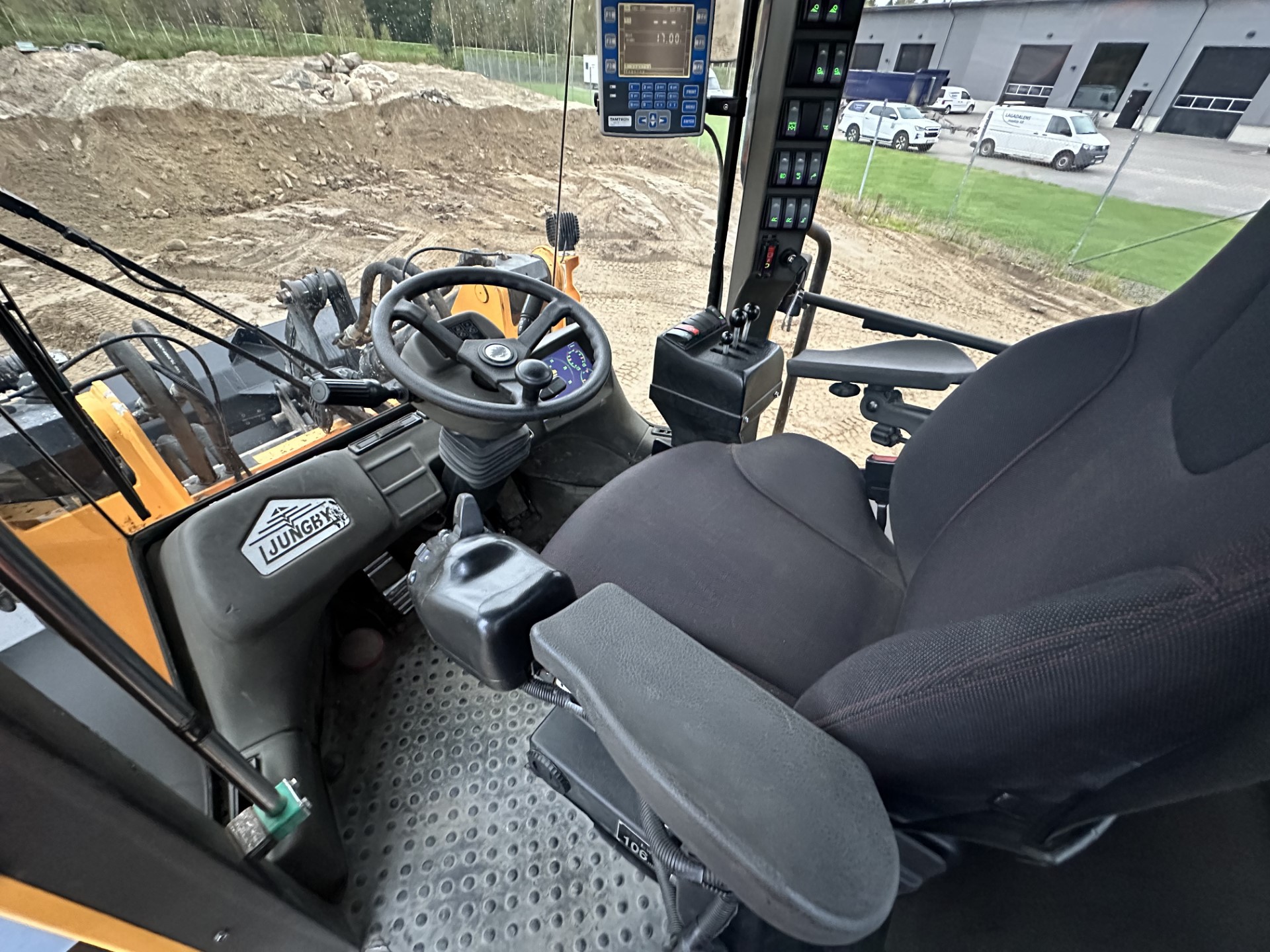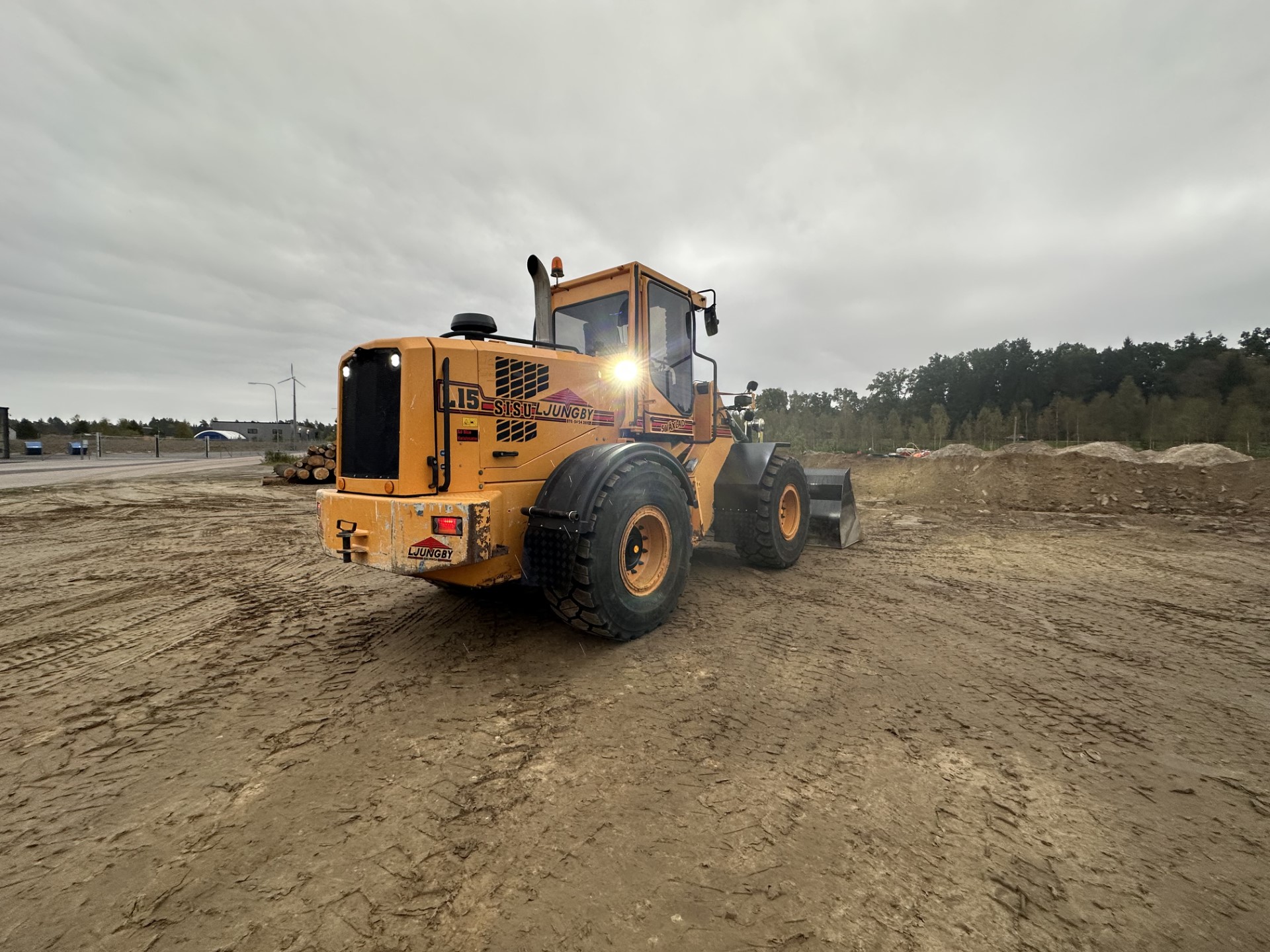 45-graders styrvinkel åt båda håll, vändradie som Volvo L70